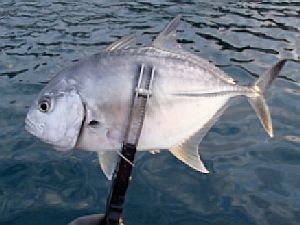 この時期のこの場所らしい釣りを楽しんでいると、小さいのが掛かってきて楽々寄せていた時に急に重くなり動かなくなった。ん~?何かに引っ掛かったかと思ったが、少しずつ横に動き出した。叩く感じはなくズズズッとラインが引き出され、横にあるロープの方へ向かっていく。ウッこれは赤い目のヤツだ。そっちはだめ~と引き留めようとするが、重機のような移動を全く止められない。諦めかけた時にフッと軽くなった。切れたのかと思ったが小さいギンガメアジが付いていた。歯形でも付いているかと見たが特に何もない。
