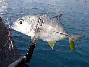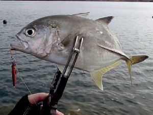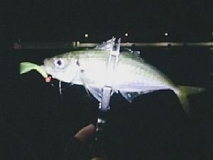 仕方なく横に移動しながら探り続けると、投げた先でヒット。良い引きだが潜られることなくキャッチ。お~いたいた、大好きなギンガメ。とりあえずキャッチ出来てホッとする。同じところに投げるとまたヒット。少しサイズアップ。また投げるとまたまたヒットで入れ食いに。サイズも20㎝台後半で良く引いて楽しい。前日は釣れなかったとのことなので、この日が開幕日だったようだ(笑)。