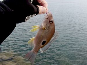 冷や汗をかいたが釣りを再開すると、相変わらず同じところに溜まっているようでエバのヒットが続く。と、また小さいのが掛かったと思ったらガッシリとくい止められてズズズッ。さっきの再現を見ているかのようにロープがある方へ向かい始めた。