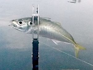 早速始めてみると、すぐにヒット。やはり青アジだ。続けるとモゾっとしたアタリでまた青アジ。別に青アジでも全然OKなのだが、明るいうちしか釣れないイメージ。そして暗くなるとやはり釣れなくなってしまった。まあ暗くなればマアジが釣れ出すだろう。