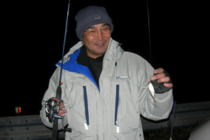 牛丼屋で合流し、帰宅する手のヒラアジさんと別れ3人でアジングロードに出ました。3ヶ所目のポイントでカツさんが即ヒットし、こりらも気合の2投目でヒット!と、やけに強い引きでドラグが出て・・・ジャンプ!ドラグとロッドの溜めだけで寄せ、スロープに横たわったのはビッグなシーバスでした。