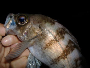 気を取り直してルアーを結び直し、同じ所を通す。しかし、同じような魚がいるはずもなく、反応無し。と、少ししてヒット! 再び岩のエグレに向かう。そうはさせるかと最初から強引に岩から引き離す。そして落ち着いた所で抜き上げ、ようやく岸壁に横たわったのは黒っぽい物体。23cmのムラソイだった。は〜、がっくし・・・(--;「ムラソイが釣れちゃいけないとは言わないけど、頼むからもう少し空気読んでくれよ〜」と、ついつい理不尽な文句をムラソイにぶつけてしまう私。その後はしばらく粘るが1度他の場所で小さいアタリがあったのみ。この場所は終わりにした。