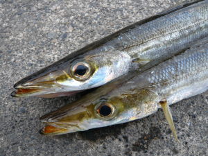 そこで兄もここに来てやると、すぐヒット。これは尺カマス、31cm。読み通りの釣果に「ちょー気持ちいい!」って、古いか(^^; その後少ししてヒット。が、バラシ。兄にもヒット。が、これもバラシ。もったいないことをしたが、まだ薄暗いうちから釣れ出したので時合いは長いかと思っていたのだが、その後ぱったりアタリが無くなってしまった。え? 時合いは10分で終わり? 3時半ぐらいから3時間も粘ってたのに・・・。つれない(釣れない)なぁ・・・って、うまいこと言ってる場合じゃないんだけど(^^;
