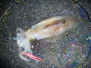 30分ぐらいした時に兄の呼ぶ声が。「来たのかな?」とタモを持って行くと、良型アオリと格闘中だった。パッと見でもそれなりの型なのが分かる。すでに寄っていたのですぐにタモ入れしようとするが、下に逃げたりとなかなかの抵抗。危うくエギを引っ掛けるところだった。これをミスするわけにはいかない。慎重にタモ入れし、ようやくネットに収まった。釣れたのは60cm枠のネットの中でもしっかり自己主張するだけのサイズがある。その場で量ると1.5kg。今までアオリは小型を数杯しか釣ったことのなかった兄はかなり嬉しそうで、早速友人に迷惑メールを連発(^^;