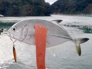 漁港に着いてみると北風がビュービュー吹いて水面はザブザブ、めちゃくちゃ寒い。気温は6℃しかない。しばらくキャストして反応が無かったが、諦めずにあちこちやっているとヒット。いいサイズのギンガメだ。その後もポツポツとヒットして一安心。どれも良く引いたので、水温低下は表層だけなのかもしれない。
