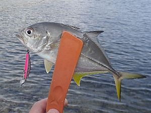 2か所で釣れなかったのでちょっと心配になったが、次に向かった小河川は新子のエバに大人気。すごく狭くて浅い場所だが例年良く釣れる好ポイントだ。今年は少し時期が遅れてしまったので数が減っているかと思ったが、一投目から元気にヒット。新子のエバ(ロウニンアジ)だ。その後も連続でヒット。アタリが遠のいたら少し移動して投げるとまた連発。ギンガメアジ、オニヒラアジ混じりで良く釣れた。やっとこの時期らしいエバの数釣りが出来て満足満足。