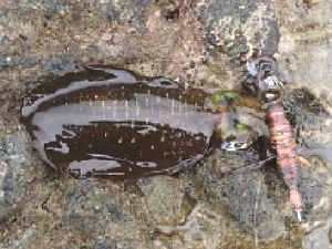 続いて平らな地磯。満潮時は潮をかぶるが、だいぶ下がっていて広く狙える。波の穏やかな西側にまわりキャストしていると、エギが戻ってきたときに追尾してくるのが見えた。フォールでお触りしたが、合わせるとすっぽ抜け。