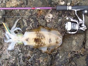 投げ直してしゃくっていると今度は沖の方でヒット。やっと今シーズン初のアオリイカをキャッチできた。だがそれにしても小さい(汗)。磯の縁を移動しながら投げ倒して、同じようなサイズを2匹追加。引きを楽しむようなサイズではないが、この時期はこんなものか。