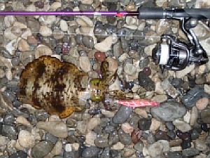 無事に釣れたので終了、のはずだがこの状況では終われない。もう少し延長。するとまたまたコツンとイカパンチ。パンチの多い日だ。今度も誘って誘って・・・乗らない。投げ直して誘い続けるが、根掛かりしてしまった。ここで無念のラインブレイク、終了。