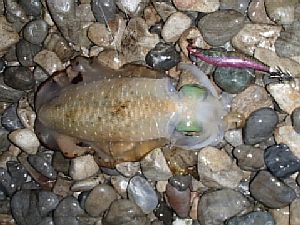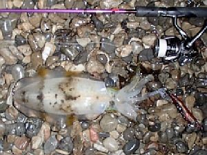 するとエギがかなり手前に来たところでスーッと持って行くアタリ。これは掛けるのは難しそうと思いつつ合わせると、ヒット。クンクンと引く小型だが、早めの時間にうれしいアオリイカ。この一杯のおかげで以後は釣りに集中することが出来た。追加を期待して引き続きキャスト。しかしその後は長くアタリの無い時間が続く。