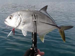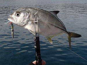 次の場所へ向かう途中、皆さんは昼食をとるために停車。私は個人的な事情で一緒に食事をとるのが難しいので一人で先に行くことに。河口に着いて早速遠投開始。ボトムを探っていると何投目かでアタリあり。そして次のキャストでヒット。グングンと良く引いて良型のギンガメアジをキャッチ。やっとこの日の一匹目だ。さらに続けているとまたヒット。先ほどよりも良く引く。あげてみるとサイズアップしたギンガメ。日中のボトムに溜まる典型的な冬メッキ。いや~嬉しい。