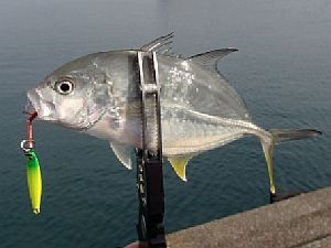 その後は特に行く場所を連絡していなかったが、夕間詰は朝と同じ実績場所に戻って合流するだろうからそれまでは一人でランガン。大きく移動して県をまたぎ紀東の入り口の港へ。ジグを大遠投してボトムを探るとヒット。ちょっと小さいがオニヒラアジがいた。そこから連続でオニヒラアジがヒット。3連発でちょっとドキドキしたが、その後は沈黙。でもこの時期らしい釣れ方でなかなか楽しめた。