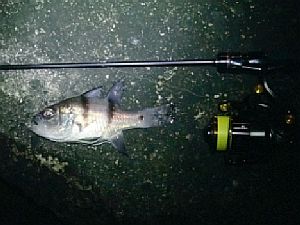 着いてみると係留船の間隔が狭くなっていてちょっとやりにくいが、風は弱いので何とかなりそうだ。背後の常夜灯の明かりが効いてきて、今か今かとアタリを待つ。キャストを繰り返すが全くアタリがない。ん~ダメなのか、と思っていたら何かが掛かった。微妙な引きでアジではない。水面に見えたところでパカッと口を開けた小さなガシラ。いや違う、ここでは珍しいメバルをキャッチ。置いてみると15cmぐらいか?上半身はメバルのように見えたが、下半身が何だか違う。どうやらイシモチ系だったようだ。それにしてもデカい(笑)。