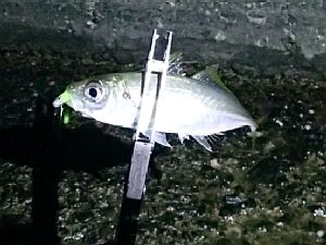 まあそんなにうまく群れが来るはずもなく、諦めかけた時にツンッとアタリ。何やら引きが弱い魚が掛かったが、すぐにバレてしまった。なんだと思って同じところにキャストするとすぐにヒット。キュンキュンという小アジの引きだ。そして無事にキャッチ成功。いや~良かった。アタリが分からなかったので次こそはアタリをとるぞ~と集中する。するとモゾッとしたアタリ。ピシッと合わせると乗った、よっしゃー、気持ちエエ~(笑)。
